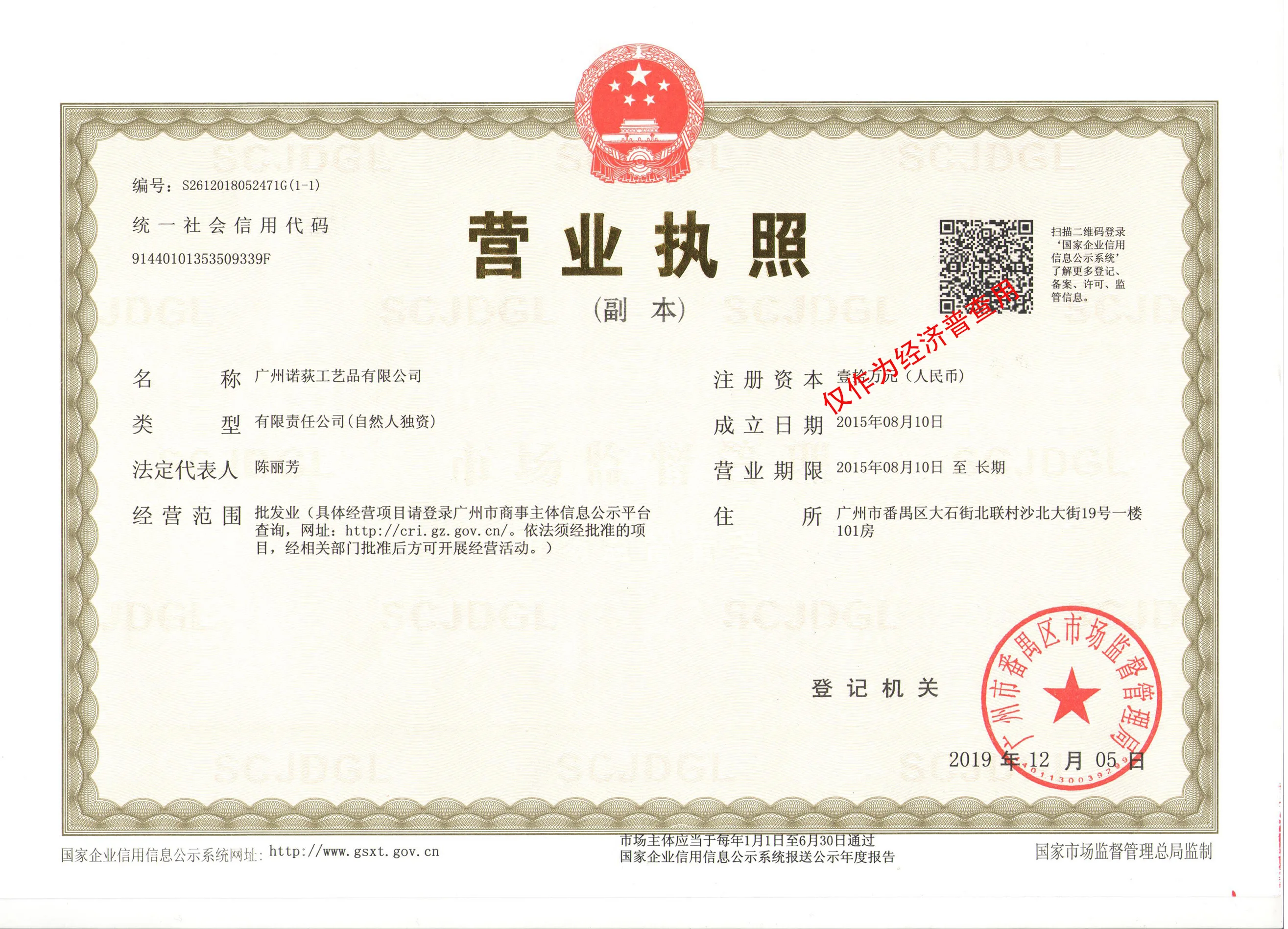 Registered address : Room 101, 1st Floor, No. 19 Shabei Street, Beilian Village, Dashi Street Guangzhou Guangdong China